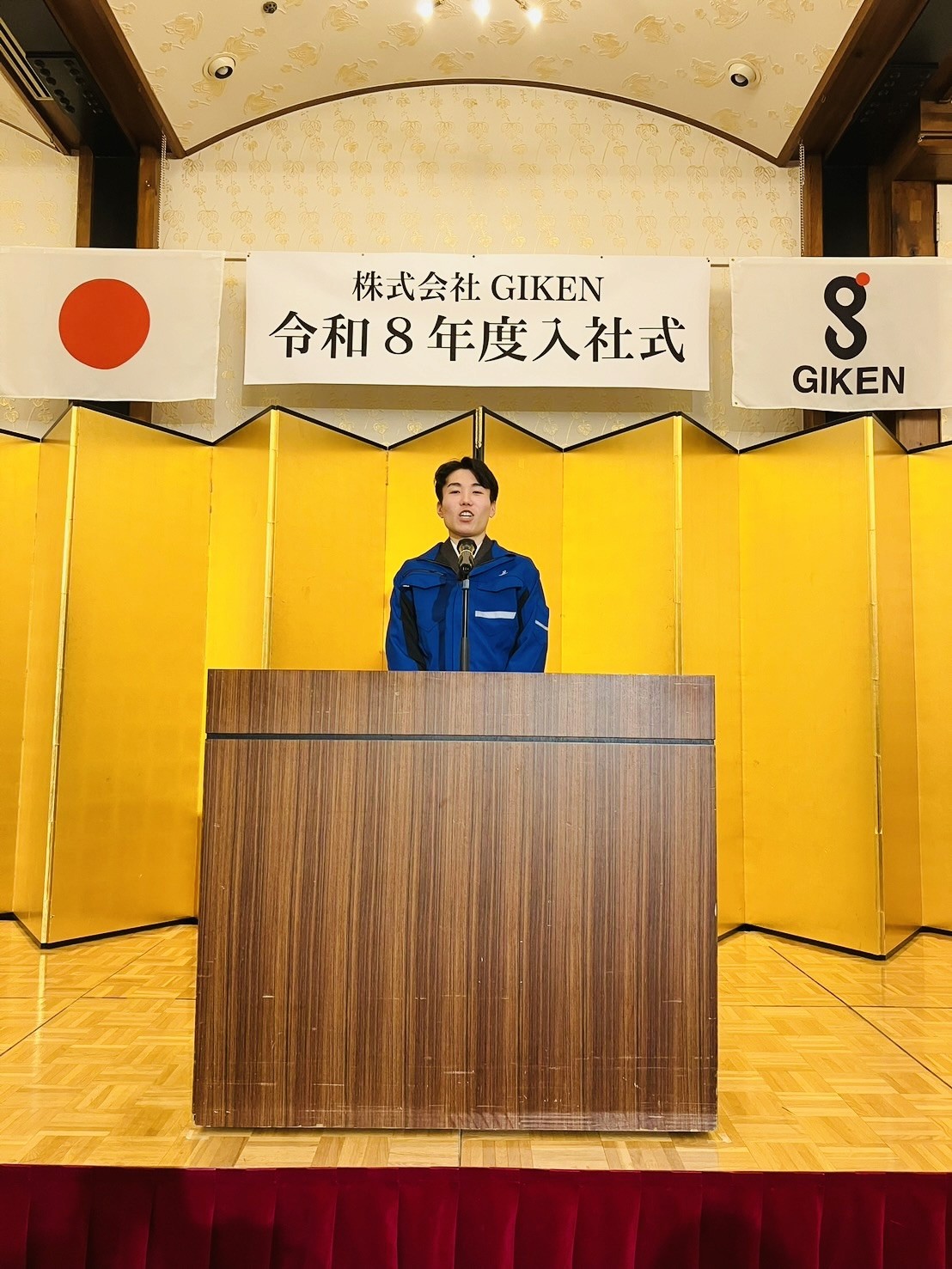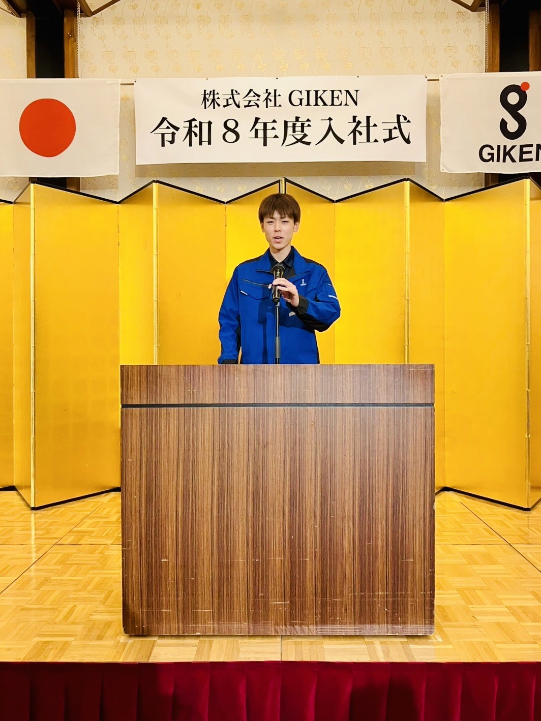 また、弊社のシンボルである「ブルージャケット」と「GIKENピン」が授与され、辞令交付とともに正式にGIKENの一員として迎え入れられました。