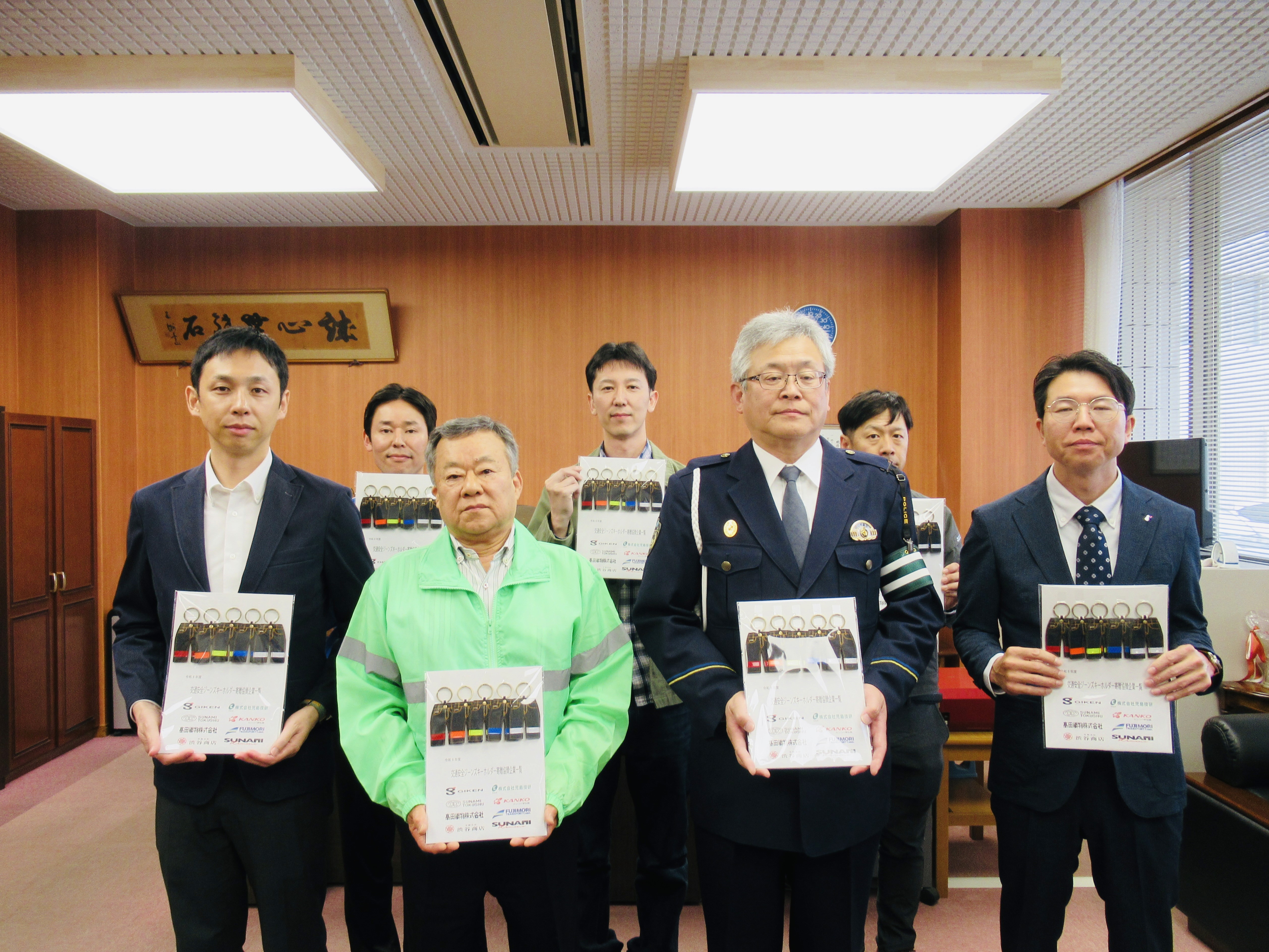当日は寄贈式を執り行い、児島警察署の皆様へお守りをお渡しするとともに、地域の交通安全に対する意識を改めて共有する機会となりました。