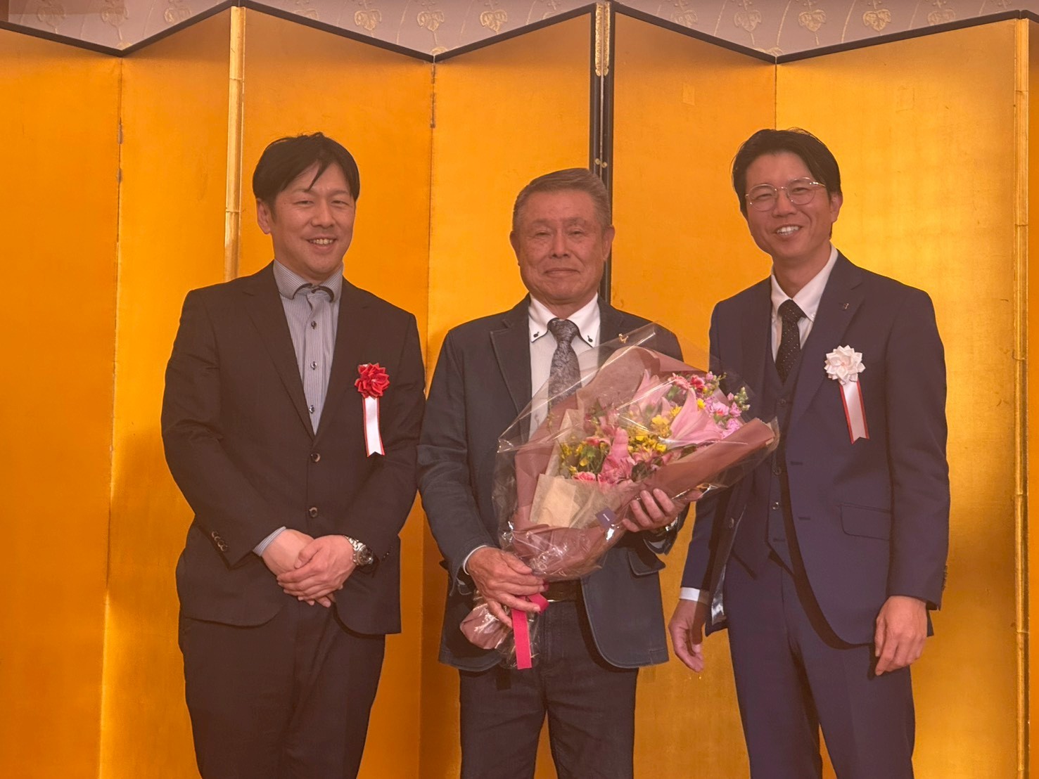 また、創業時から尽力されました尾﨑会長の役員退任式も執り行われ、全社員より感謝の花束を贈らせていただきました。